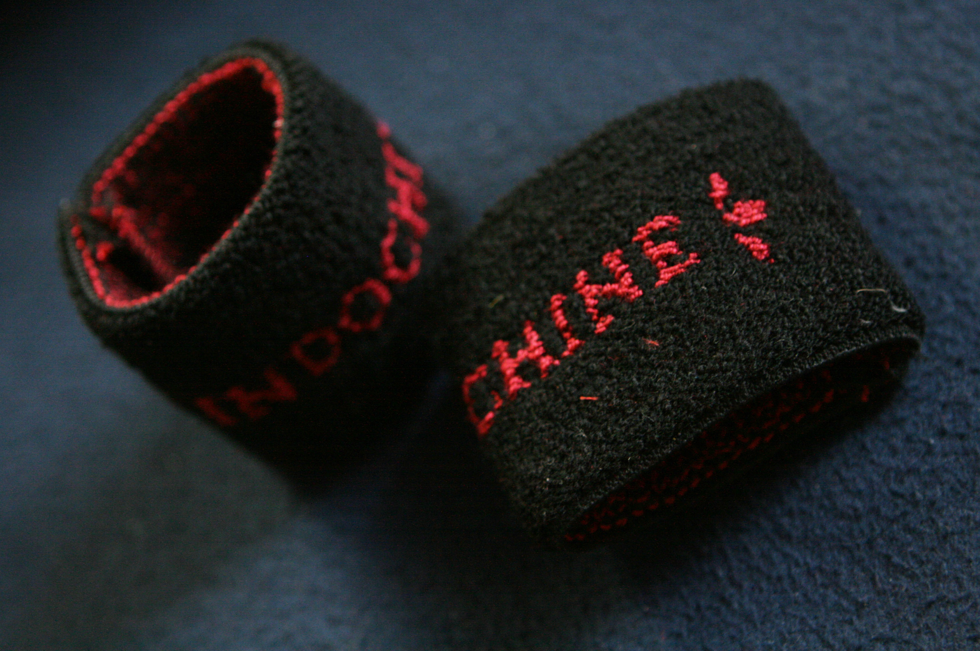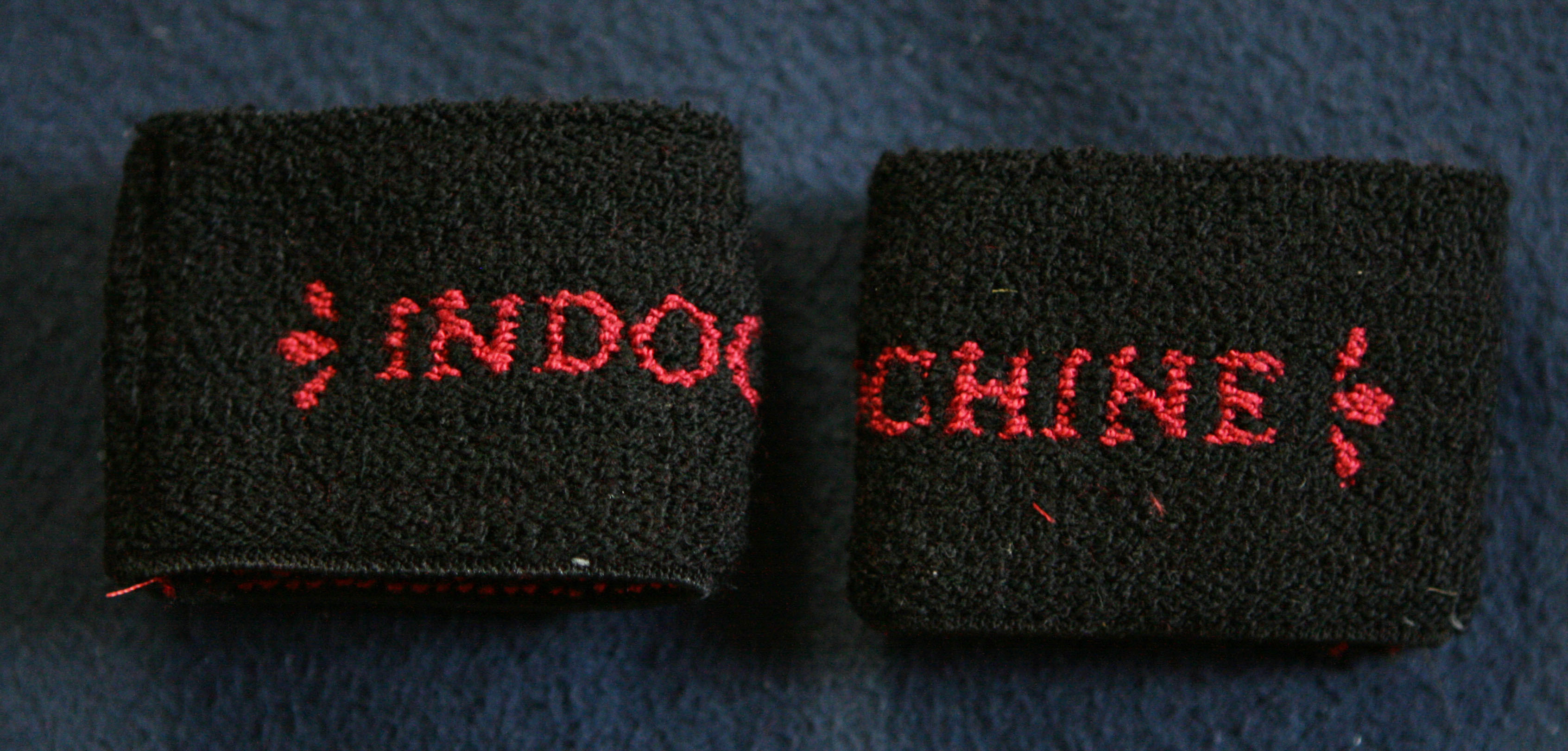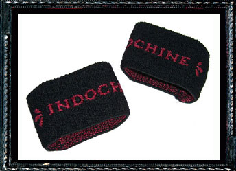 - Lot de 2 bracelets en éponge noir, inscription "Indochine" en rouge.