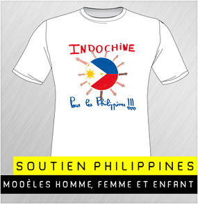 • Pour aider les Philippines, dévastées par le typhon Haiyan, Indochine propose ce t-shirt dessiné par la fille de Nicola. La totalité de la somme, soit 25€, sont intégralement reversée à la Croix-Rouge française pour les Philippines.